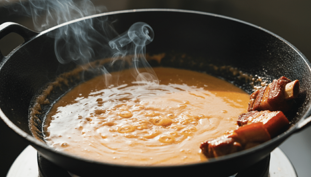 Deglaze: While the caramel’s still loose, splash in some Shaoxing wine (1-3 tablespoons) and scrape up any stuck bits. Add your soy sauces, aromatics for five spice braising flavors (ginger, star anise, scallion whites), and enough water or stock to barely cover the pork. Stir until the caramel dissolves, and you’re off to the races.
