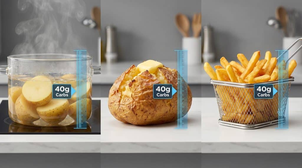 Here’s the thing that blew my mind when I first learned it: the carbs in your food don’t change when you cook them. A potato has 37 grams of carbs whether you boil it, bake it, or turn it into those crispy little roasted cubes I could eat by the sheet pan. Same grams. Same math.