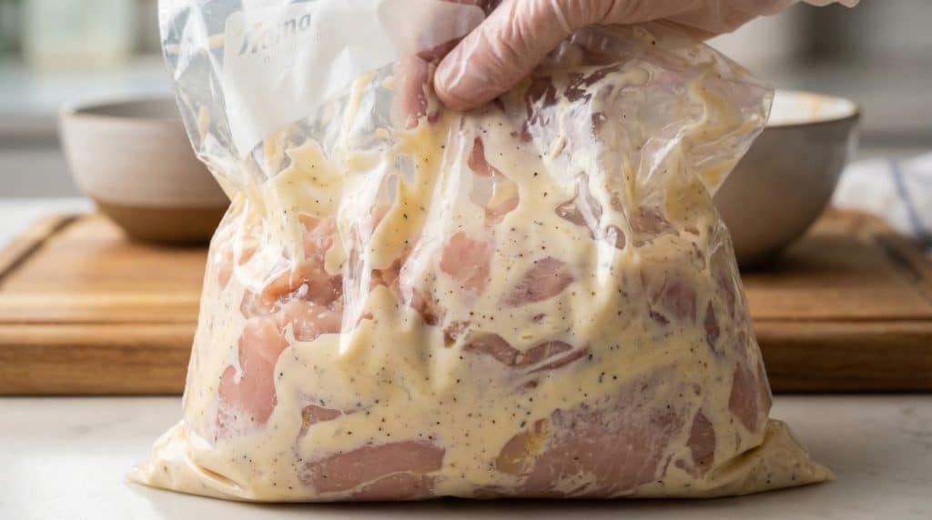 - Pat it dry, toss it in a bag with homemade white BBQ sauce, and marinate in the fridge for the right amount of time.