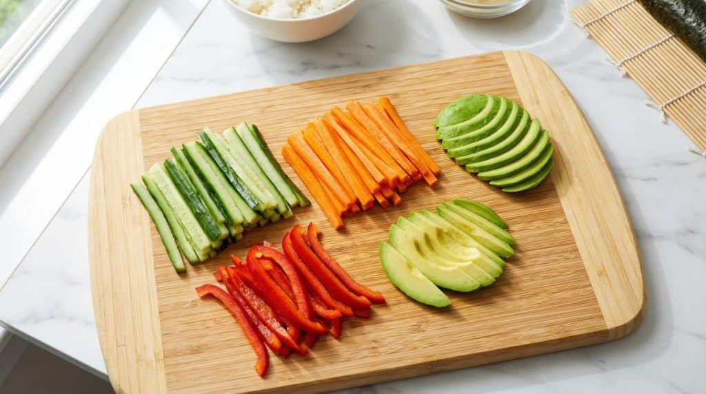 Structure over flavor. A veggie can taste amazing and still wreck your roll if it’s too soft. You need pieces that hold their shape through rolling AND slicing.
